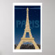 Colorful rendering of the Eiffel Tower against a starlit sky with the lights of Paris below.