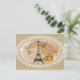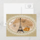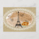 Eiffel Tower on a background of vintage french postcards and a map of Paris. A pretty white swirly frame and yellow flowers