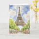 This watercolor artwork beautifully captures the iconic Eiffel Tower, towering above a bustling Parisian street scene. The soft, fluid brushstrokes evoke a light and airy atmosphere, with vibrant green trees and colorful market stalls lining the foreground. The detailed structure of the tower contrasts with the playful, impressionistic depiction of the crowd, creating a charming balance between architectural precision and artistic whimsy. The blue sky and scattered clouds add a serene backdrop, enhancing the romantic charm of the scene.