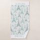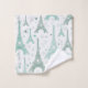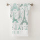Eiffel towers illustrated in turquoise and blue/green gray with hand-drawn style hearts in a repeating pattern. Personalize with your name or message in purple font.
