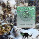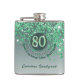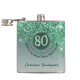 On a chic Green Glitter, and Green gradient background, the birthday flask has a unique number 80, decorated with sparkling, Green Glitter, and outlined with Gold, and shiny stars. The number is displayed, on a modern plain circle, forming a charming wheel, with dots and stripes.