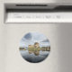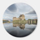 Round photo magnet with historic Eilean Donan Castle on a quiet morning with reflection in the still water at the western coast of Scotland, near Isle of Skye.
