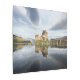 Photo on metal print of historic Eilean Donan Castle on a quiet morning with reflection in the still water at the western coast of Scotland, near Isle of Skye.