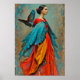 “Elaris” - Feathers of Becoming. Wrapped in the plumage of change, this powerful figure wears transformation like armour. The vivid red and blue tones and flowing textures speak of liberation through evolution. Each fold and flutter reveals her journey from form to freedom, strength to softness, woman to wing.