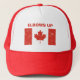 This is a red and white trucker hat accented with the Canadian Flag and that says ELBOWS UP. It's a great way for anyone to show support for Canada!