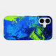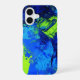 A vibrant and abstract painting featuring thick, expressive brushstrokes of paint in a dynamic mix of electric blue, deep navy, and vivid lime green. The texture is palpable, with layers of paint built up to create a sense of movement and energy. The composition is chaotic and energetic, with the contrasting colors clashing and blending in a powerful, non-representational way.