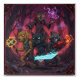 A bold fantasy illustration featuring a heroic team of animals—a dog with an electric hammer, a black cat wielding a glowing sword, a raccoon with a red energy weapon, and a mystical owl casting a purple orb. Set in a dark, eerie forest with vivid neon highlights, this dynamic artwork blends adventure, power, and comic-style intensity. Perfect for fans of epic creature battles and electrifying fantasy scenes.