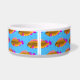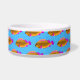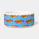 This fun dog bowl features bright orange and pink tropical fish on a background of line art and a beautiful ocean blue.