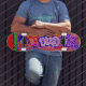 A brilliantly colored digital image of a graffiti-covered store gate on a condemned building in New York City gives this skateboard an edgy, urban feel.
