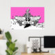 Black white electric guitar with wings poster print, featuring an electric guitar, wings, flames and swirls on music pentagram, notes and treble clef on hot pink background. A great gift for a musician, guitar player or lover.