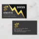 A faux gold lightning strike demarcates an upper black layer against its lower grey piece. At the top of the card you have your prestigious name. To its left is a gold letter-e home cable logo you can use. This is followed by the business name "electric" which you can change. Contact details or captions are placed in their respective gold "electrical symbol" buttons near the base.