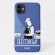 Cartoon Illustrations of an electrician at work. Electrician and electrical repairs illustration in a fun cartoon style. Man is looking at various wires as he rewires a property. Personalise it with your choice of name. Phone case for an electrician.