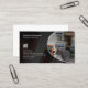 This electrician business card features an electrician testing the circuits breakers using electrician tools. The image appears within a semi-sphere on the right side of the card. The left side of the card features a translucent black background that allows the background image to faintly show through. Your name, title, logo and business address appears within this black background.