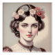 An artistic portrait of a young woman with delicate beauty in a vintage style. She wears a crown of pink, white and pale blue flowers in her wavy black hair. His complexion is pale, contrasting with his red lips. She is dressed in a period dress with a lace collar and a dark ribbon around her neck with a camel.