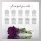 This beautiful wedding seating chart has table assignments for 100 guests at 10 tables (10 people per table.) The design is stylish, classy, romantic and chic, featuring a single plum purple or eggplant colored rose reflecting in water with waves and ripples. There is a lacy script calligraphy title reading "please find your table" as well as space for the names of the couple and the wedding date. Great way to make your reception beautiful while helping your guests find the right seat.