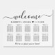 Elegant wedding seating chart foam board sign for up to 10 tables featuring "welcome" in a chic script with swashes, your names and wedding date joined together by a heart and "We're so glad you're here" in classic serif typography.