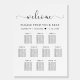 Elegant wedding seating chart foam board sign for up to 10 tables featuring "welcome" in a chic script with swashes, "Find Your Seat" in classic serif typography, your names and wedding date joined together by a heart and the table numbers and guest names in simple modern typography.
