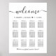 Elegant wedding seating chart poster sign for up to 12 tables featuring "welcome" in a chic script with swashes, your names and wedding date joined together by a heart and "We're so glad you're here" in classic serif typography. If desired, select the digital download option to edit with last minute changes and print locally.