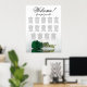 This elegant wedding seating chart has 14 tables and exudes a romantic, sophisticated, and beautiful design. With table assignments for 140 guests and 10 seats per table, this chart provides ample seating arrangements for your wedding reception. The design features a single long-stemmed deep emerald green colored rose lying on its side and reflecting in a pool of water. The title, "Welcome! please find your table," is written in fancy script calligraphy, while there is space available for the names of the couple and the wedding date at the bottom. This seating chart is a wonderful way to add beauty, class, and style to your wedding reception while making it easy for your guests to find their seats.