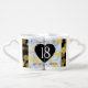 Nothing says "you complete me" or "your better/other half" than these 18th porcelain wedding anniversary lovers' mugs. Elegant lettering with gold-dusted hexagonal confetti on white and porcelain blue marbled backgrounds add a memorable touch for this special occasion and milestone. Customize with couple's names, and years of marriage or a congratulatory message. Reverse shows identical design.