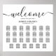 Modern wedding table seating chart plan poster featuring a stylish white background, the word "welcome" in a elegant calligraphy script font, your names, wedding date, and a wedding seating chart template of 27 tables.