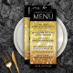 Add sophistication to 27th music wedding anniversary celebrations with this dinner menu, which features elegant lettering and musical note confetti on gold foil and black backgrounds. Customize with couple's names, dates of marriage, venue details, menu items, and congratulatory messages.