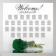 Introduce your wedding reception in style with this stunning 29 table seating chart adorned with a classic design featuring a single long-stemmed deep emerald green colored rose lying on its side, beautifully reflecting in water. The elegant script lettering welcomes guests with the message "Welcome! Please find your table" and has space for 290 names or guests with ten seats per table, accompanied by the couple's names and wedding date at the bottom. This seating chart exudes sophistication, style, and romantic elegance, making it a wonderful way to add a touch of glamour to your special day while helping your guests find their seats with ease.