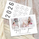 Elegant Script 2 Photo Happy New Year 2026 Calendar. Available digitally and printed. Replace the two sample photos with your own and personalise with your greeting and names at the bottom. Happy New Year is in a trendy set script. A handy 2026 calendar is on the other side.