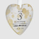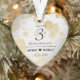 Celebrate the 3rd leather wedding anniversary with this commemorative ornament! Elegant black lettering with gold-dusted hexagonal confetti on a luxurious white leather background bordered by a stylized outline of a heart in muted gold foil add a memorable touch for this special occasion and milestone. Customize with couple's names and wedding date. Reverse shows identical design.
