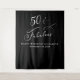Elegant personalized 50th birthday party tapestry black photo booth backdrop with "50 & Fabulous" written in a stylish white script. Customize with her name and birthday date