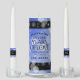 Make the 51st sapphire wedding anniversary or the renewal of your vows an unforgettable celebration with this commemorative unity candle set! Elegant lettering with hexagonal confetti on a sapphire blue background add a memorable touch for this special occasion and extraordinary milestone. Customize with couple's names, initials, and dates of marriage.