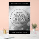 Celebrate the 70th platinum wedding anniversary with this stylish commemorative acrylic sign. The number 70 in the heart artistically stands in for the letter 'O' in love, while elegant lettering with hexagonal confetti on simulated platinum foil bordered by black panels add a memorable touch for this special occasion and extraordinary milestone. Customize with couple's names, dates of marriage, and congratulatory messages.