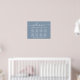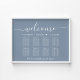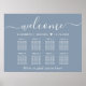 Elegant downloadable dusty blue wedding seating chart poster sign for up to 8 tables that features "welcome" in a chic white script with swashes, your names and wedding date joined by a heart and "We're so glad you're here" in classic white serif typography. You can select the digital download option to edit with last minute changes and print locally.
