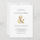This elegant wedding invitation features a faux gold ampersand with watercolor look blush pink and gold flowers, for a modern and dramatic look.