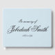 This minimalist funeral or memorial guestbook features the message "In memory of", along with a custom name, and birth/death dates. It could be used to record condolences for the relatives and friends of somebody who has recently passed away.