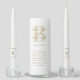 Elegant antique gold wedding unity candle set featuring the couple's names and a personalized quote or verse in warm, refined typography. The wedding date is beautifully displayed with monogram initials adorning each taper candle. A cherished wedding ceremony keepsake with all text fully customizable.