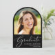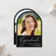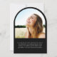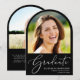 Elegant arch-shaped black graduation announcement featuring the grad's photo, "Graduate" in a stylish white script, and their name, class year and school in simple, modern white typography. Add an additional photo and your personalized announcement on the back.