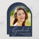 Arch blue graduation announcement featuring the grad's photo, "Graduate" in an elegant white script, and their name, class year and school in simple, modern white typography.