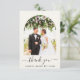 Elegant light cream wedding thank you card featuring your wedding day photo in an arch frame, "thank you" in a chic script with swashes and your first names and wedding date joined with a heart. On the reverse side, add an additional photo, personalize your thank you message and add your names in a signature-like script.