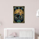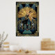 A sophisticated blend of nature and 1920s skyscraper architecture. This striking illustration features a bold black silhouette of a maple tree, its leaves forming a perfect canopy against a radiant gold sunburst. The tree rises from an intricate, tiered Art Deco base in warm orange and gold tones, framed by a majestic teal geometric archway. This opulent piece is perfect for adding a touch of Gatsby-era glamour to a modern office, study, or luxury living room.