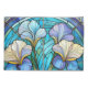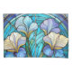 Colorful Art Nouveau pillow case printed with a stained-glass look alike botanical pattern with irises in tones of teal, blue and pale pastel purple.