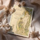 Capture the essence of timeless elegance with this Art Nouveau-inspired wedding menu card, featuring a stunning floral goddess surrounded by delicate iris blooms. The soft hues of ivory, sage green, muted lavender, and gentle gold accents create a refined and ethereal aesthetic, perfect for vintage-inspired weddings. With a beautifully detailed illustration reminiscent of Mucha's art style, this menu card exudes romance and sophistication. Ideal for couples looking to add a touch of old-world charm and artistry to their special day, this card is both a piece of art and a functional keepsake for guests.