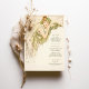 This beautiful wedding dinner menu showcases an exquisite Art Nouveau design, featuring illustrations reminiscent of Alphonse Mucha's iconic style. The front of the menu highlights a serene woman surrounded by intricate patterns and floral motifs in soft, earthy tones of cream, muted gold, sage green, and delicate pastels. The vintage elegance of the illustration evokes a sense of timeless beauty, making it perfect for a classic or art-inspired wedding. The reverse side presents a lovely image of a woman holding a glass, adding a celebratory touch, with the detailed dinner menu printed in an elegant font. Ideal for couples seeking an artistic and vintage aesthetic for their special day.
