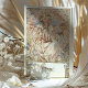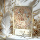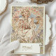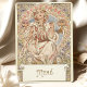 This beautiful wedding dinner menu showcases an exquisite Art Nouveau design, featuring illustrations reminiscent of Alphonse Mucha's iconic style. The front of the menu highlights a serene woman surrounded by intricate patterns and floral motifs in soft, earthy tones of cream, muted gold, sage green, and delicate pastels. The vintage elegance of the illustration evokes a sense of timeless beauty, making it perfect for a classic or art-inspired wedding. The reverse side presents a lovely image of a woman holding a glass, adding a celebratory touch, with the detailed dinner menu printed in an elegant font. Ideal for couples seeking an artistic and vintage aesthetic for their special day.