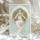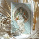 This stunning wedding menu card draws inspiration from the elegance of Alphonse Mucha's iconic Art Nouveau style. Featuring a graceful figure with floral elements and soft pastels, this menu exudes a timeless beauty, perfect for any sophisticated wedding celebration. The front showcases an exquisite illustration of a woman holding a dish, while the back continues the theme with another elegant figure in a radiant, circular design. The delicate menu details, written in refined typography, provide a luxurious presentation of the evening's meal, offering your guests an unforgettable dining experience.