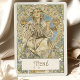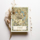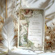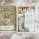 This beautiful wedding dinner menu showcases an exquisite Art Nouveau design, featuring illustrations reminiscent of Alphonse Mucha's iconic style. The front of the menu highlights a serene woman surrounded by intricate patterns and floral motifs in soft, earthy tones of cream, muted gold, sage green, and delicate pastels. The vintage elegance of the illustration evokes a sense of timeless beauty, making it perfect for a classic or art-inspired wedding. The reverse side presents a lovely image of a woman holding a glass, adding a celebratory touch, with the detailed dinner menu printed in an elegant font. Ideal for couples seeking an artistic and vintage aesthetic for their special day.