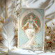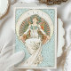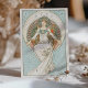 This stunning wedding menu card draws inspiration from the elegance of Alphonse Mucha's iconic Art Nouveau style. Featuring a graceful figure with floral elements and soft pastels, this menu exudes a timeless beauty, perfect for any sophisticated wedding celebration. The front showcases an exquisite illustration of a woman holding a dish, while the back continues the theme with another elegant figure in a radiant, circular design. The delicate menu details, written in refined typography, provide a luxurious presentation of the evening's meal, offering your guests an unforgettable dining experience.