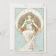 This stunning wedding menu card draws inspiration from the elegance of Alphonse Mucha's iconic Art Nouveau style. Featuring a graceful figure with floral elements and soft pastels, this menu exudes a timeless beauty, perfect for any sophisticated wedding celebration. The front showcases an exquisite illustration of a woman holding a dish, while the back continues the theme with another elegant figure in a radiant, circular design. The delicate menu details, written in refined typography, provide a luxurious presentation of the evening's meal, offering your guests an unforgettable dining experience.
