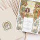 Enhance your wedding reception with our Elegant Art Nouveau Wedding Drinks Menu Card. Featuring exquisite illustrations inspired by the Art Nouveau movement, this card showcases intricate floral motifs and graceful figures in rich hues of gold, sage green, and coral. The front of the card lists a delightful selection of cocktails, beers, and wines, elegantly presented in a classic serif font. The back continues the vintage charm with a beautifully detailed floral emblem. Perfect for adding a touch of sophistication and timeless elegance to your special day.