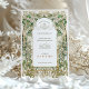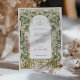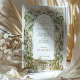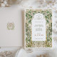 This stunning wedding save-the-date card showcases a beautifully detailed Art Nouveau design, featuring an intricate border of delicate white blossoms and lush green leaves, all framed in ornate gold accents. The front of the card highlights the important wedding details, framed by graceful floral arches and curvilinear patterns, offering a touch of vintage elegance. On the back, a simple yet refined emblem of intertwined initials encased in a golden floral wreath adds an extra level of sophistication. The color palette blends soft ivory, forest green, sage, and shimmering gold, creating a timeless and elegant aesthetic perfect for nature-inspired or vintage-themed weddings. Ideal for couples seeking a refined and artistic wedding announcement.